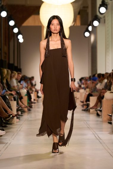Sinuosi drappeggi e abiti foulard, modelli kimono o con gonne simmetriche e ancora suits oversize, fantasie rigate e accenti di rosa sfilano a New York sulla passerella Primavera/Estate 2026 di Michael Kors Collection