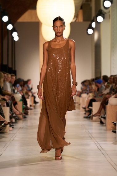 Sinuosi drappeggi e abiti foulard, modelli kimono o con gonne simmetriche e ancora suits oversize, fantasie rigate e accenti di rosa sfilano a New York sulla passerella Primavera/Estate 2026 di Michael Kors Collection