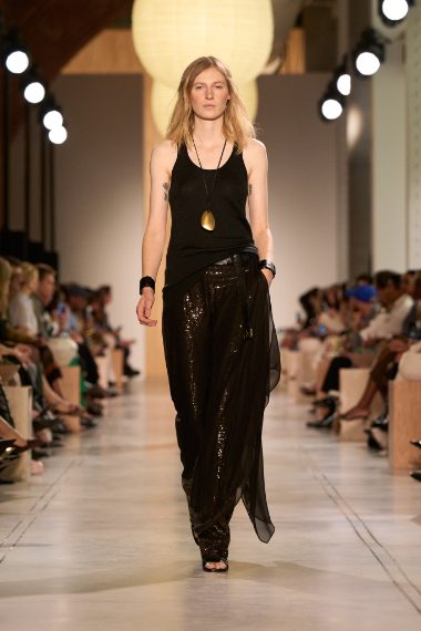 Sinuosi drappeggi e abiti foulard, modelli kimono o con gonne simmetriche e ancora suits oversize, fantasie rigate e accenti di rosa sfilano a New York sulla passerella Primavera/Estate 2026 di Michael Kors Collection