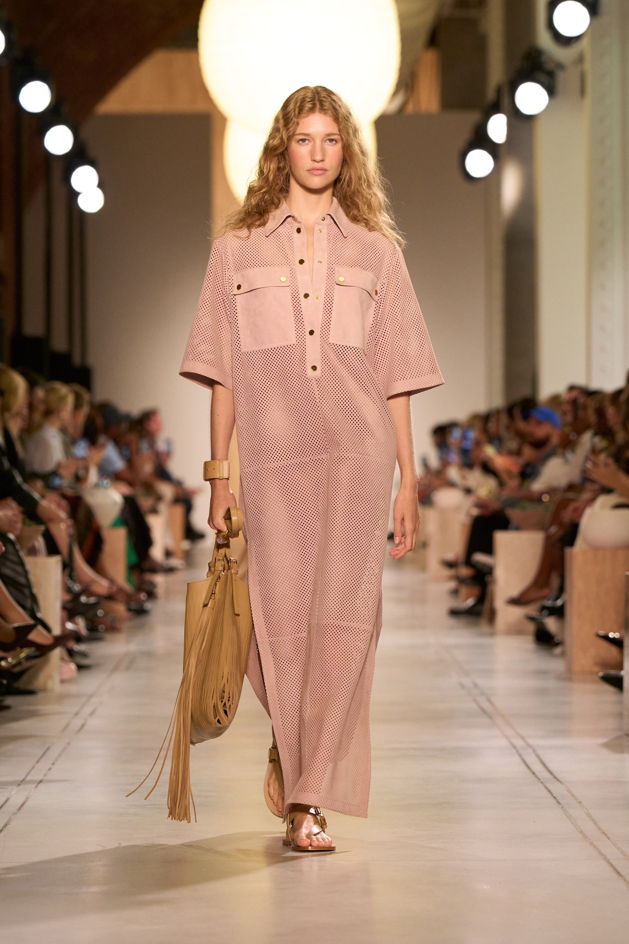 Sinuosi drappeggi e abiti foulard, modelli kimono o con gonne simmetriche e ancora suits oversize, fantasie rigate e accenti di rosa sfilano a New York sulla passerella Primavera/Estate 2026 di Michael Kors Collection