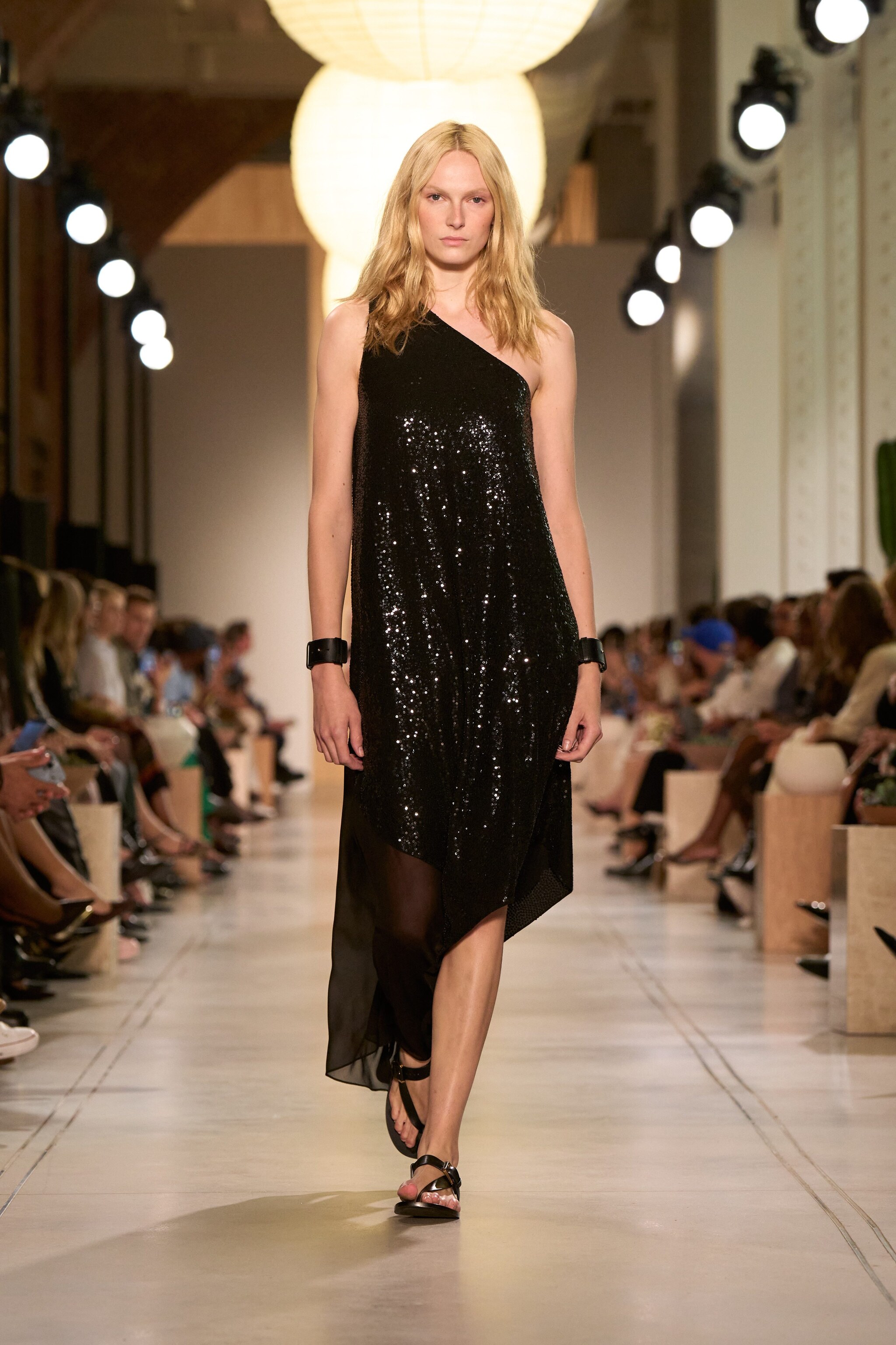 Sinuosi drappeggi e abiti foulard, modelli kimono o con gonne simmetriche e ancora suits oversize, fantasie rigate e accenti di rosa sfilano a New York sulla passerella Primavera/Estate 2026 di Michael Kors Collection