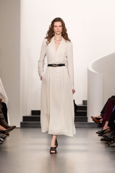 Linee pulite ed essenziali, candidi look bianchi o decorati con mini stripes, fiocchi e cravatte, e ancora sprazzi di rosso intenso, nero e e dettagli sparkling sfilano a New York sulla passerella Primavera/Estate 2026 di Ralph Lauren