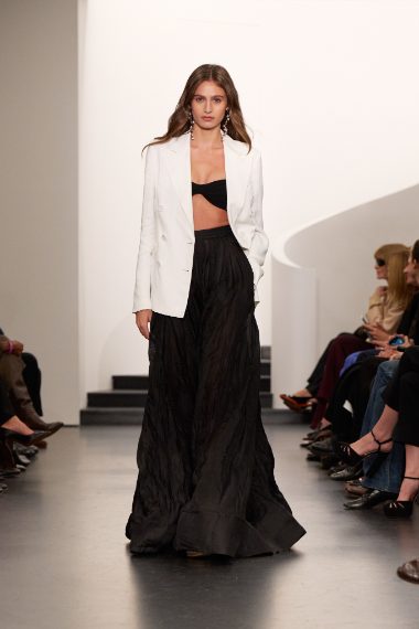 Linee pulite ed essenziali, candidi look bianchi o decorati con mini stripes, fiocchi e cravatte, e ancora sprazzi di rosso intenso, nero e e dettagli sparkling sfilano a New York sulla passerella Primavera/Estate 2026 di Ralph Lauren