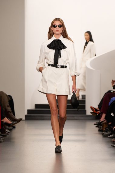 Linee pulite ed essenziali, candidi look bianchi o decorati con mini stripes, fiocchi e cravatte, e ancora sprazzi di rosso intenso, nero e e dettagli sparkling sfilano a New York sulla passerella Primavera/Estate 2026 di Ralph Lauren