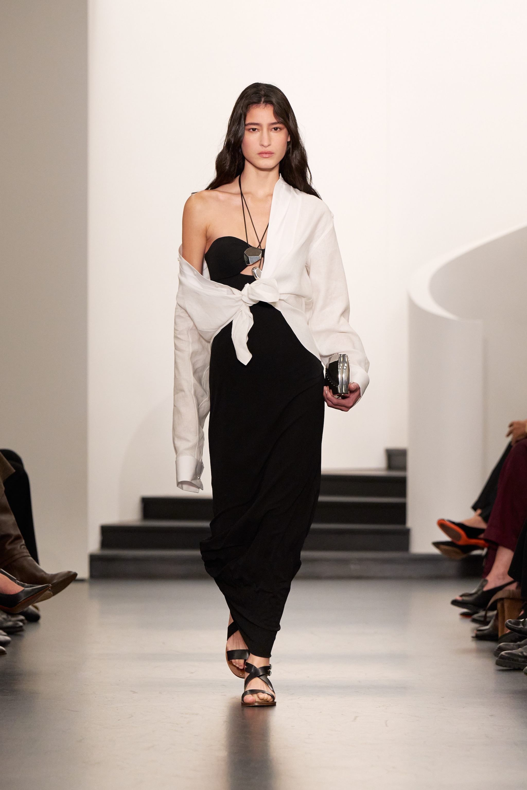 Linee pulite ed essenziali, candidi look bianchi o decorati con mini stripes, fiocchi e cravatte, e ancora sprazzi di rosso intenso, nero e e dettagli sparkling sfilano a New York sulla passerella Primavera/Estate 2026 di Ralph Lauren
