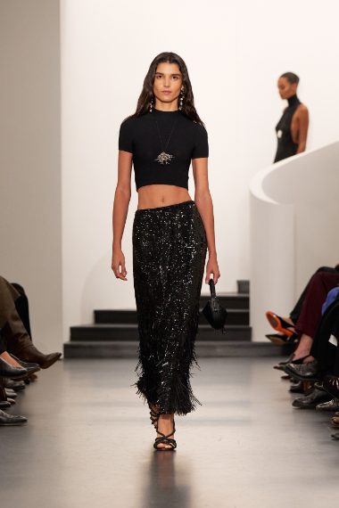 Linee pulite ed essenziali, candidi look bianchi o decorati con mini stripes, fiocchi e cravatte, e ancora sprazzi di rosso intenso, nero e e dettagli sparkling sfilano a New York sulla passerella Primavera/Estate 2026 di Ralph Lauren