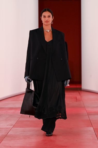 Capi scuri e abiti lingerie in pizzo, grossi pull argyle, bomber con profili furry e bossy look con blazer e cravatta sfilano sulla passerella Autunno/Inverno 2025-2026 di H&M Studio