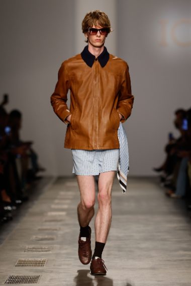 Pantaloni baggy contrapposti a tubini dalla silhouette aderente, fantasie gessate e toni caldi di marrone, rosso intenso e crema sfilano alla Milano Fashion Week sulla passerella Primavera/Estate 2026 di Iceberg
