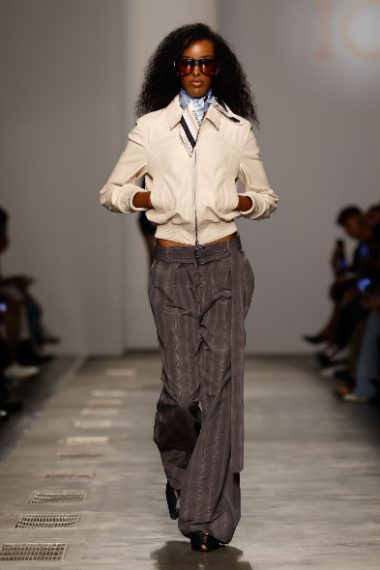 Pantaloni baggy contrapposti a tubini dalla silhouette aderente, fantasie gessate e toni caldi di marrone, rosso intenso e crema sfilano alla Milano Fashion Week sulla passerella Primavera/Estate 2026 di Iceberg