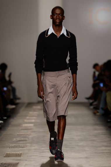 Pantaloni baggy contrapposti a tubini dalla silhouette aderente, fantasie gessate e toni caldi di marrone, rosso intenso e crema sfilano alla Milano Fashion Week sulla passerella Primavera/Estate 2026 di Iceberg
