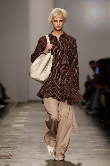 Pantaloni baggy contrapposti a tubini dalla silhouette aderente, fantasie gessate e toni caldi di marrone, rosso intenso e crema sfilano alla Milano Fashion Week sulla passerella Primavera/Estate 2026 di Iceberg