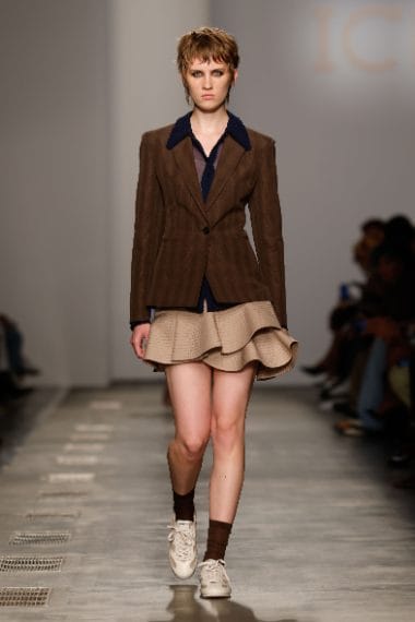 Pantaloni baggy contrapposti a tubini dalla silhouette aderente, fantasie gessate e toni caldi di marrone, rosso intenso e crema sfilano alla Milano Fashion Week sulla passerella Primavera/Estate 2026 di Iceberg