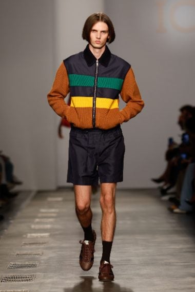 Pantaloni baggy contrapposti a tubini dalla silhouette aderente, fantasie gessate e toni caldi di marrone, rosso intenso e crema sfilano alla Milano Fashion Week sulla passerella Primavera/Estate 2026 di Iceberg