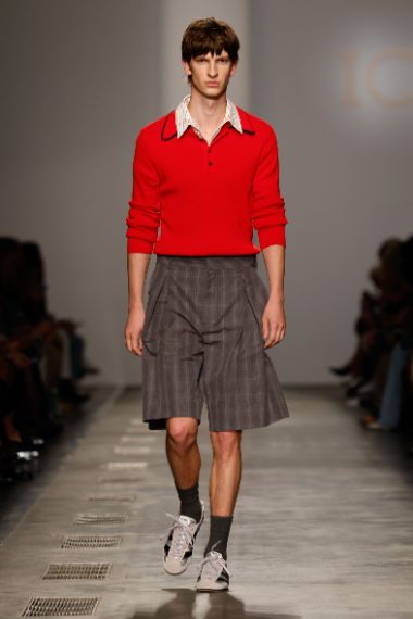 Pantaloni baggy contrapposti a tubini dalla silhouette aderente, fantasie gessate e toni caldi di marrone, rosso intenso e crema sfilano alla Milano Fashion Week sulla passerella Primavera/Estate 2026 di Iceberg