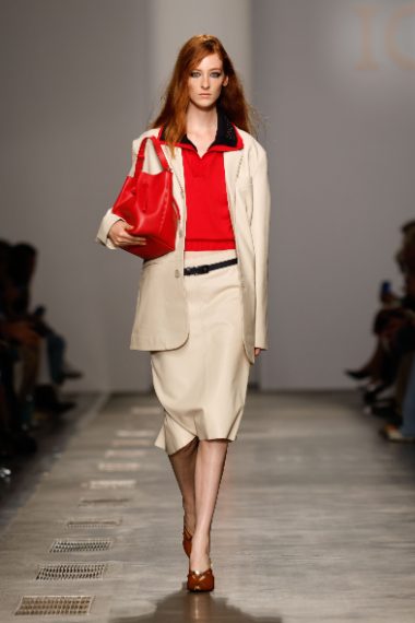 Pantaloni baggy contrapposti a tubini dalla silhouette aderente, fantasie gessate e toni caldi di marrone, rosso intenso e crema sfilano alla Milano Fashion Week sulla passerella Primavera/Estate 2026 di Iceberg