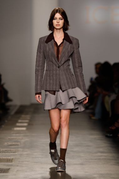 Pantaloni baggy contrapposti a tubini dalla silhouette aderente, fantasie gessate e toni caldi di marrone, rosso intenso e crema sfilano alla Milano Fashion Week sulla passerella Primavera/Estate 2026 di Iceberg