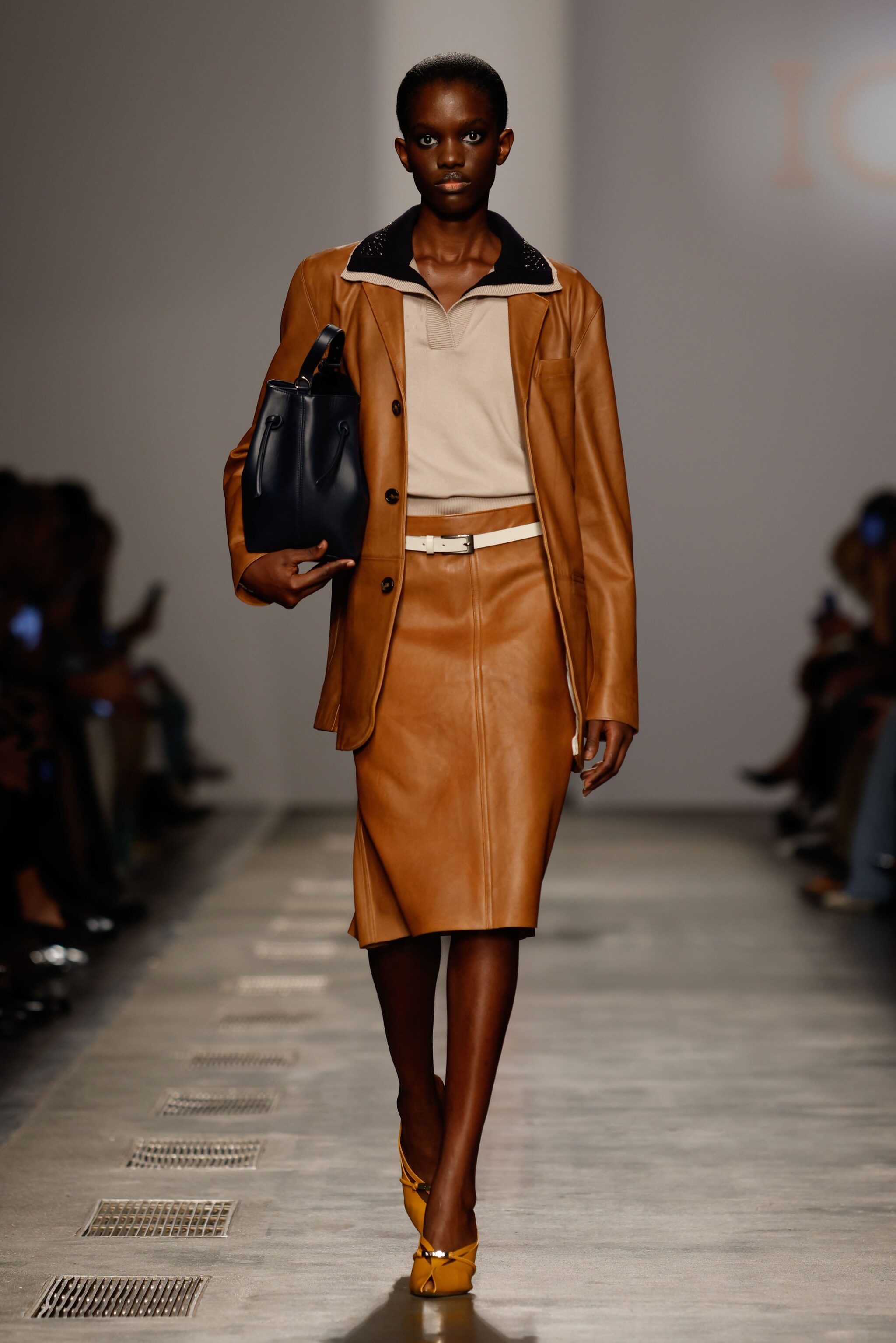 Pantaloni baggy contrapposti a tubini dalla silhouette aderente, fantasie gessate e toni caldi di marrone, rosso intenso e crema sfilano alla Milano Fashion Week sulla passerella Primavera/Estate 2026 di Iceberg