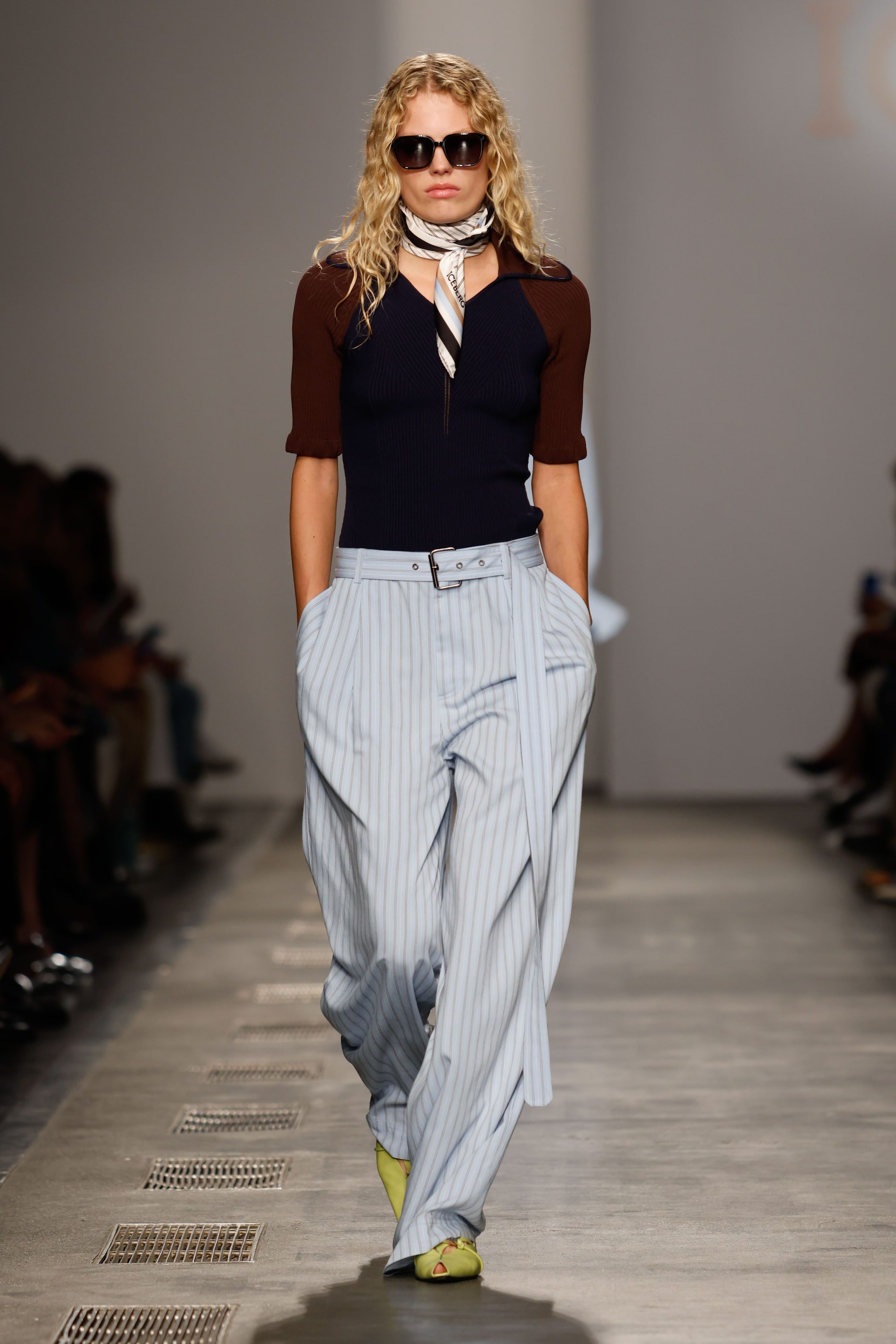 Pantaloni baggy contrapposti a tubini dalla silhouette aderente, fantasie gessate e toni caldi di marrone, rosso intenso e crema sfilano alla Milano Fashion Week sulla passerella Primavera/Estate 2026 di Iceberg