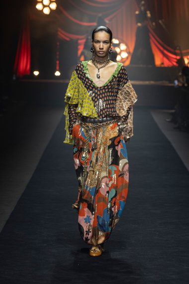 Stile folk, boho chic e gym style si mescolano sulla passerella Primavera/Estate 2026 di Etro by Marco De Vincenzo alla Milano Fashion Week, dove sfilano lunghi abiti coperti di frange colorate e ruche, ricami su capi in denim e intricate fantasie floreali che rivisitano il classico paisley della Maison