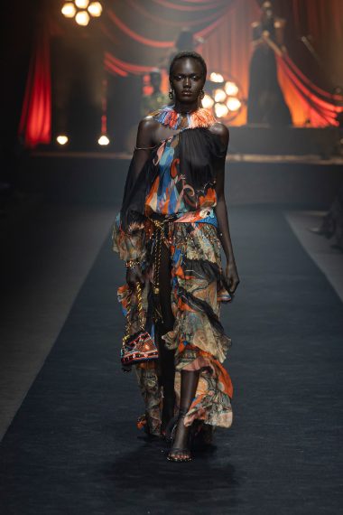 Stile folk, boho chic e gym style si mescolano sulla passerella Primavera/Estate 2026 di Etro by Marco De Vincenzo alla Milano Fashion Week, dove sfilano lunghi abiti coperti di frange colorate e ruche, ricami su capi in denim e intricate fantasie floreali che rivisitano il classico paisley della Maison