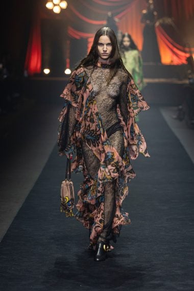 Stile folk, boho chic e gym style si mescolano sulla passerella Primavera/Estate 2026 di Etro by Marco De Vincenzo alla Milano Fashion Week, dove sfilano lunghi abiti coperti di frange colorate e ruche, ricami su capi in denim e intricate fantasie floreali che rivisitano il classico paisley della Maison