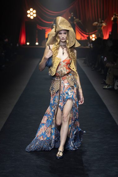 Stile folk, boho chic e gym style si mescolano sulla passerella Primavera/Estate 2026 di Etro by Marco De Vincenzo alla Milano Fashion Week, dove sfilano lunghi abiti coperti di frange colorate e ruche, ricami su capi in denim e intricate fantasie floreali che rivisitano il classico paisley della Maison