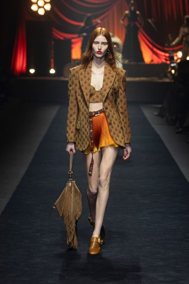 Stile folk, boho chic e gym style si mescolano sulla passerella Primavera/Estate 2026 di Etro by Marco De Vincenzo alla Milano Fashion Week, dove sfilano lunghi abiti coperti di frange colorate e ruche, ricami su capi in denim e intricate fantasie floreali che rivisitano il classico paisley della Maison