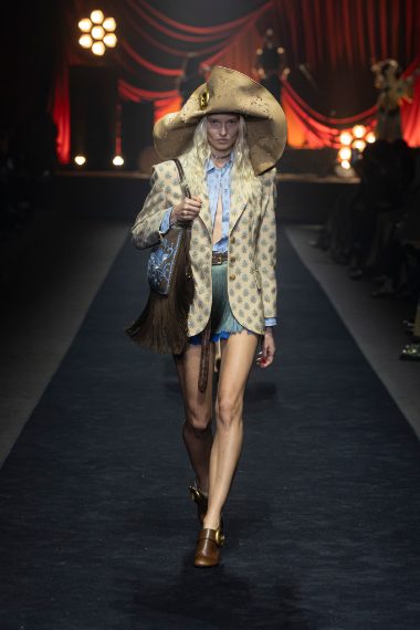 Stile folk, boho chic e gym style si mescolano sulla passerella Primavera/Estate 2026 di Etro by Marco De Vincenzo alla Milano Fashion Week, dove sfilano lunghi abiti coperti di frange colorate e ruche, ricami su capi in denim e intricate fantasie floreali che rivisitano il classico paisley della Maison
