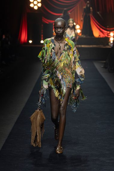 Stile folk, boho chic e gym style si mescolano sulla passerella Primavera/Estate 2026 di Etro by Marco De Vincenzo alla Milano Fashion Week, dove sfilano lunghi abiti coperti di frange colorate e ruche, ricami su capi in denim e intricate fantasie floreali che rivisitano il classico paisley della Maison