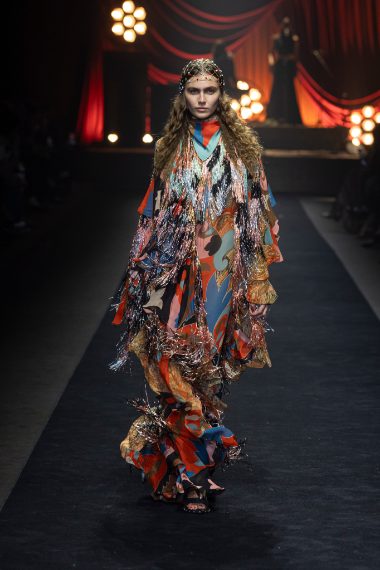 Stile folk, boho chic e gym style si mescolano sulla passerella Primavera/Estate 2026 di Etro by Marco De Vincenzo alla Milano Fashion Week, dove sfilano lunghi abiti coperti di frange colorate e ruche, ricami su capi in denim e intricate fantasie floreali che rivisitano il classico paisley della Maison