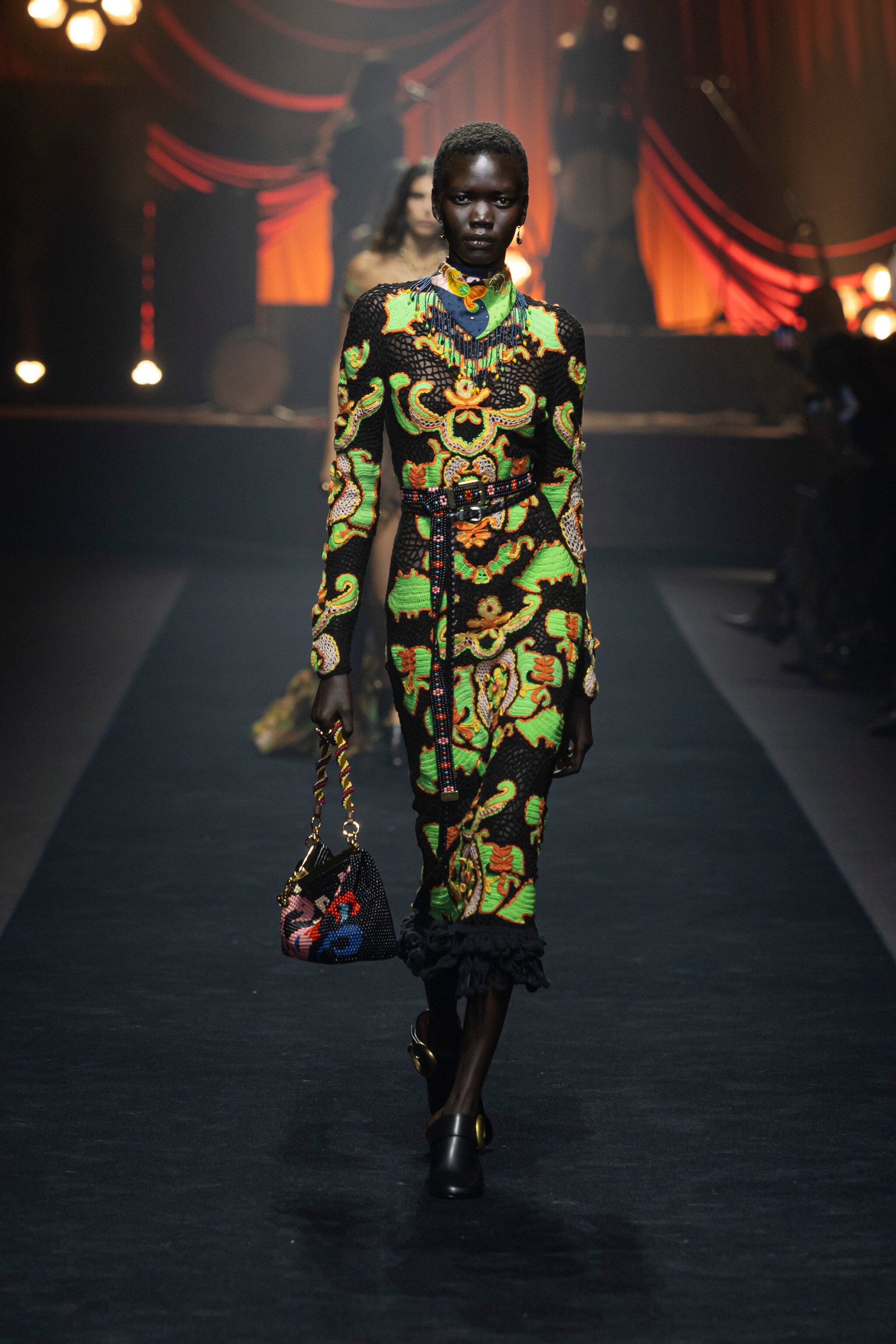 Stile folk, boho chic e gym style si mescolano sulla passerella Primavera/Estate 2026 di Etro by Marco De Vincenzo alla Milano Fashion Week, dove sfilano lunghi abiti coperti di frange colorate e ruche, ricami su capi in denim e intricate fantasie floreali che rivisitano il classico paisley della Maison