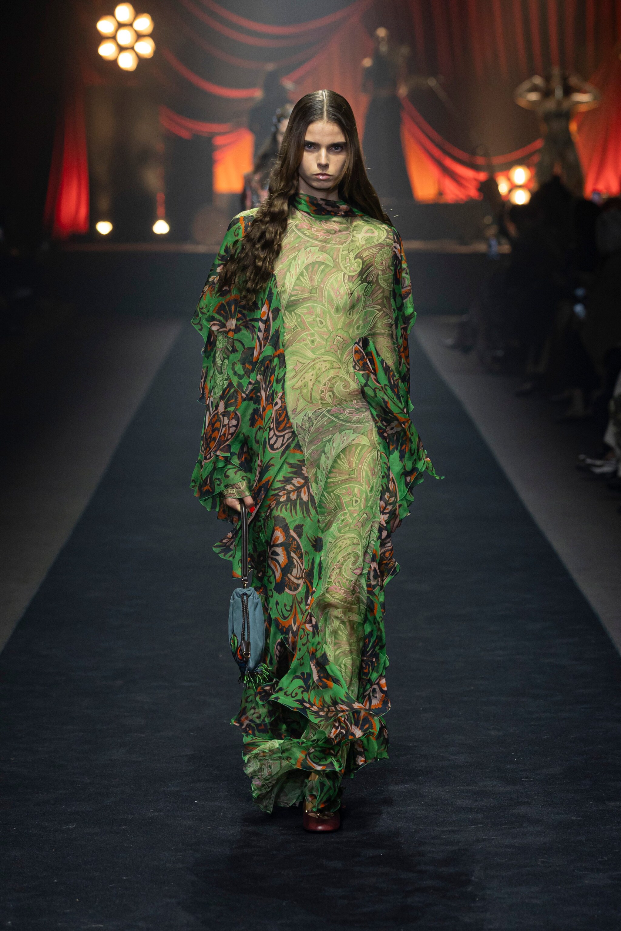 Stile folk, boho chic e gym style si mescolano sulla passerella Primavera/Estate 2026 di Etro by Marco De Vincenzo alla Milano Fashion Week, dove sfilano lunghi abiti coperti di frange colorate e ruche, ricami su capi in denim e intricate fantasie floreali che rivisitano il classico paisley della Maison