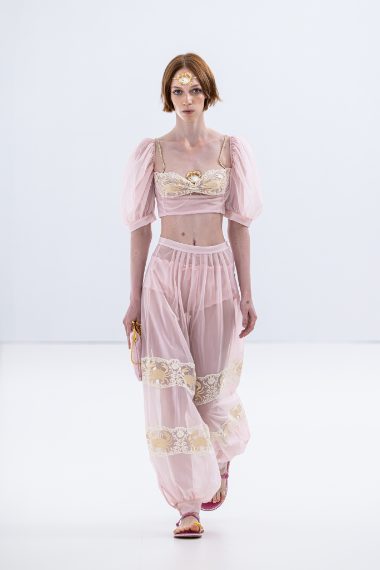 Bianco candido, rosa pallido e verde menta, gonne ballon e volumetrici drappeggi e ancora fantasie a scacchi e abiti a rete sfilano alla Milano Fashion Week sulla passerella Primavera/Estate 2026 di Vivetta