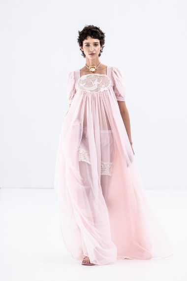 Bianco candido, rosa pallido e verde menta, gonne ballon e volumetrici drappeggi e ancora fantasie a scacchi e abiti a rete sfilano alla Milano Fashion Week sulla passerella Primavera/Estate 2026 di Vivetta