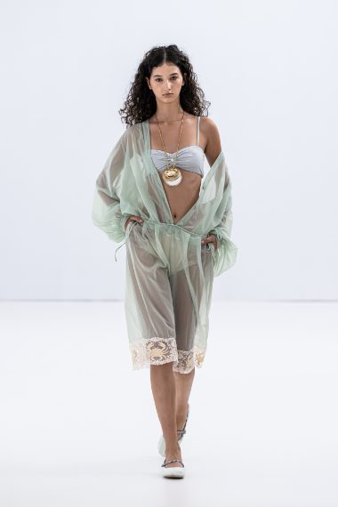 Bianco candido, rosa pallido e verde menta, gonne ballon e volumetrici drappeggi e ancora fantasie a scacchi e abiti a rete sfilano alla Milano Fashion Week sulla passerella Primavera/Estate 2026 di Vivetta