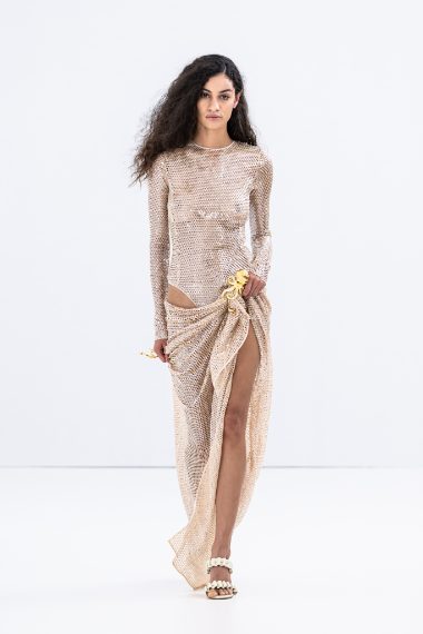 Bianco candido, rosa pallido e verde menta, gonne ballon e volumetrici drappeggi e ancora fantasie a scacchi e abiti a rete sfilano alla Milano Fashion Week sulla passerella Primavera/Estate 2026 di Vivetta