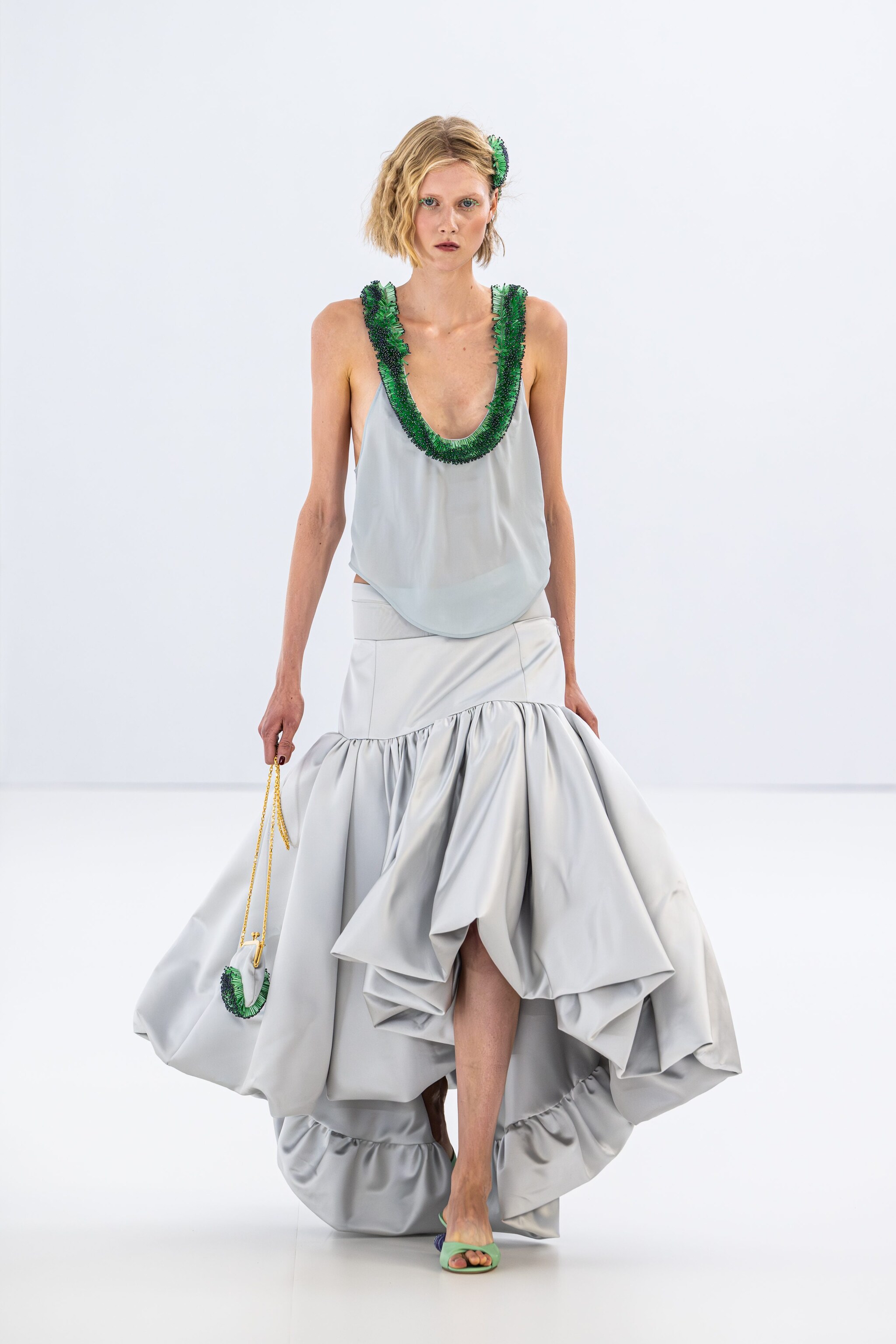 Bianco candido, rosa pallido e verde menta, gonne ballon e volumetrici drappeggi e ancora fantasie a scacchi e abiti a rete sfilano alla Milano Fashion Week sulla passerella Primavera/Estate 2026 di Vivetta