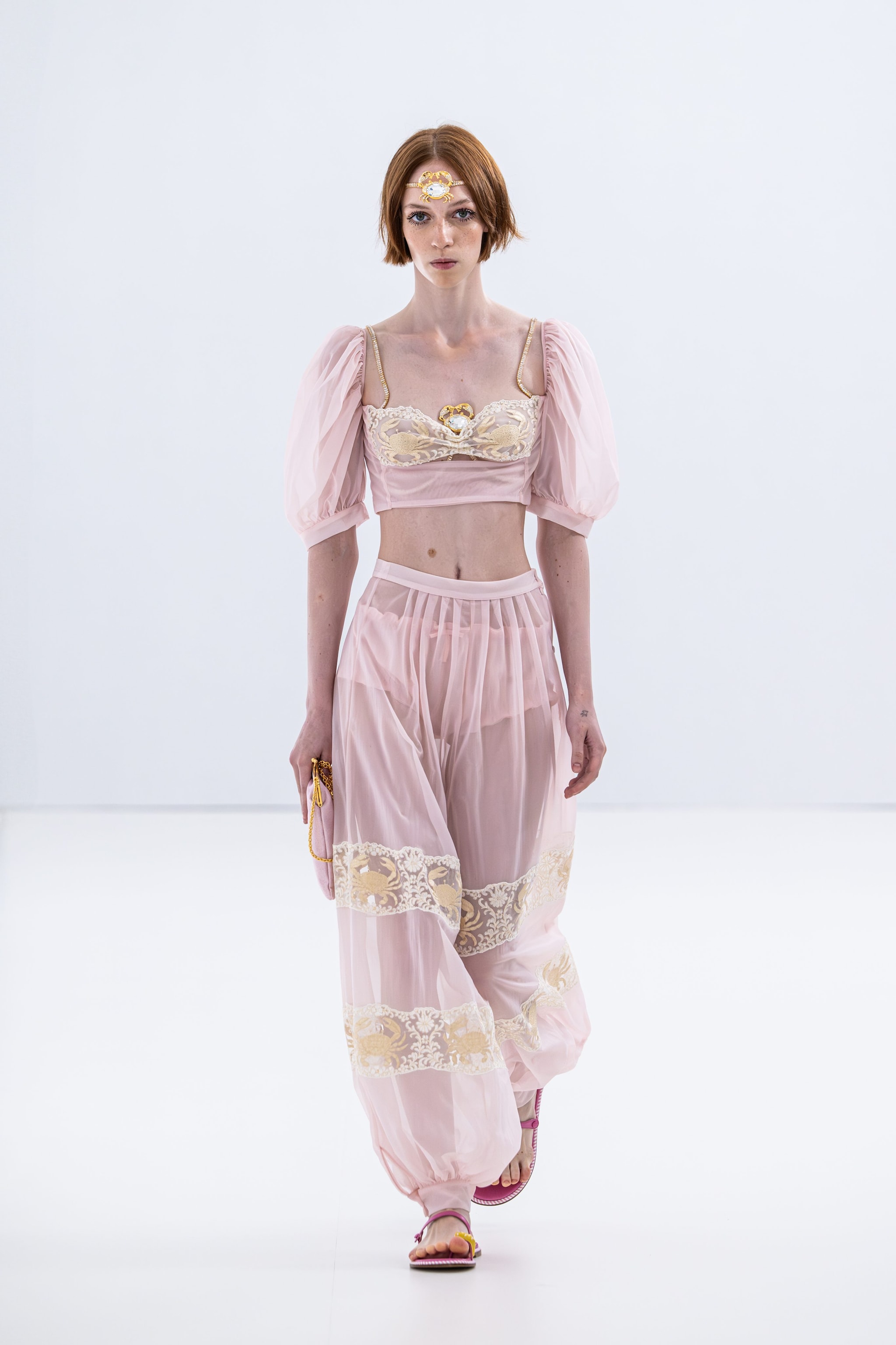 Bianco candido, rosa pallido e verde menta, gonne ballon e volumetrici drappeggi e ancora fantasie a scacchi e abiti a rete sfilano alla Milano Fashion Week sulla passerella Primavera/Estate 2026 di Vivetta