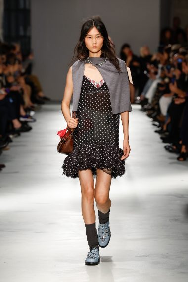 Giacche in pelle dalla silhouette eightees, abiti in lamè dorato, vestiti sottoveste indossati con maxi felpe e impalpabili modelli in seta trasparente sfilano alla Milano Fashion Week sulla passerella Primavera/Estate 2026 di N21