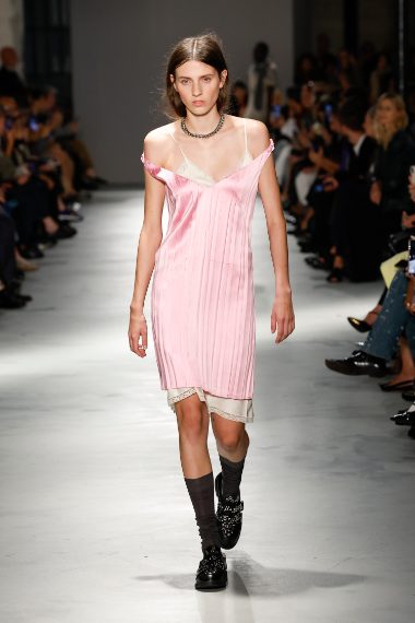 Giacche in pelle dalla silhouette eightees, abiti in lamè dorato, vestiti sottoveste indossati con maxi felpe e impalpabili modelli in seta trasparente sfilano alla Milano Fashion Week sulla passerella Primavera/Estate 2026 di N21