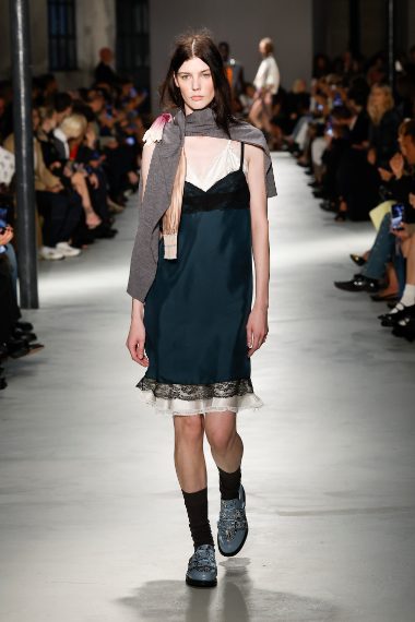 Giacche in pelle dalla silhouette eightees, abiti in lamè dorato, vestiti sottoveste indossati con maxi felpe e impalpabili modelli in seta trasparente sfilano alla Milano Fashion Week sulla passerella Primavera/Estate 2026 di N21