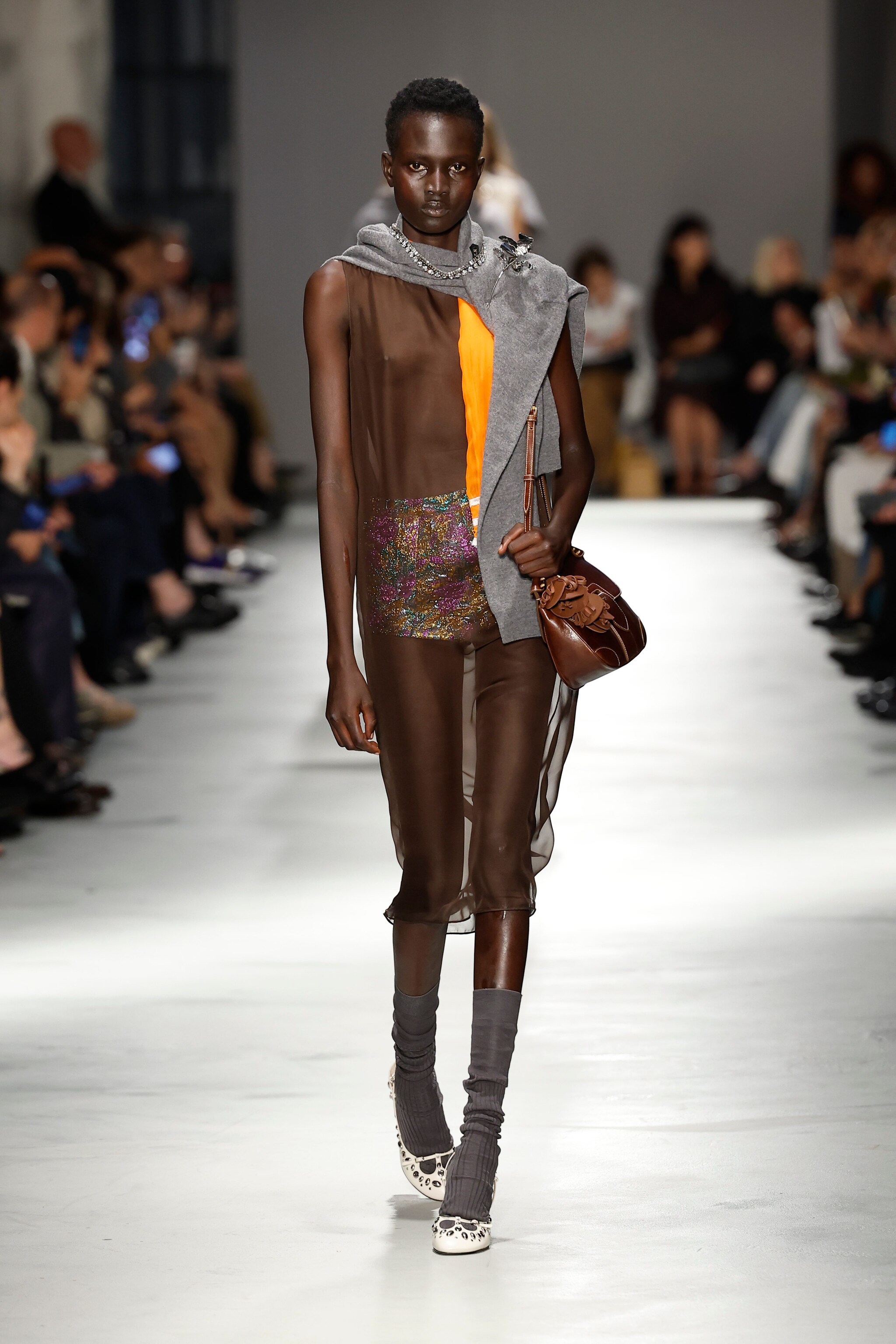 Giacche in pelle dalla silhouette eightees, abiti in lamè dorato, vestiti sottoveste indossati con maxi felpe e impalpabili modelli in seta trasparente sfilano alla Milano Fashion Week sulla passerella Primavera/Estate 2026 di N21