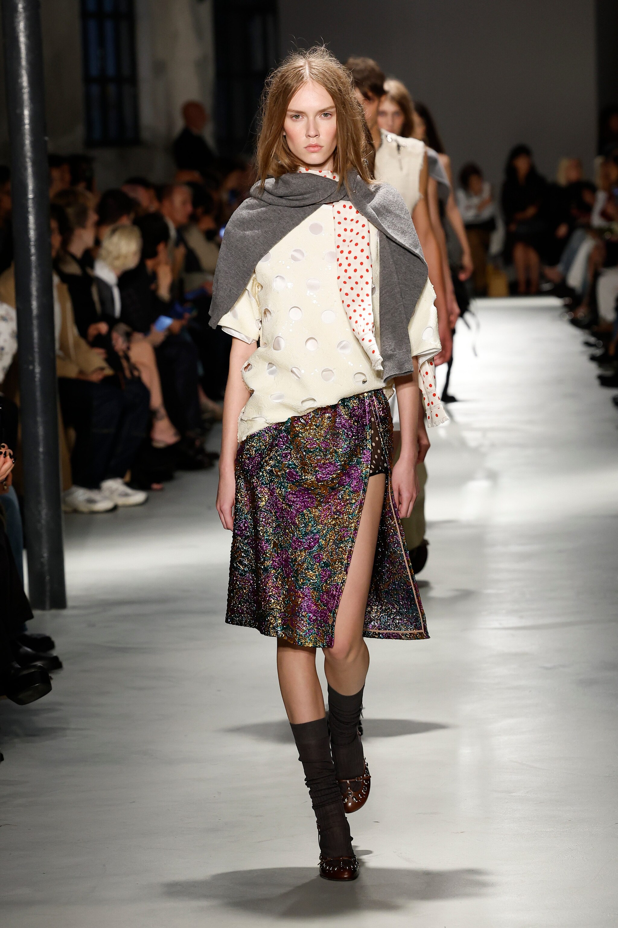 Giacche in pelle dalla silhouette eightees, abiti in lamè dorato, vestiti sottoveste indossati con maxi felpe e impalpabili modelli in seta trasparente sfilano alla Milano Fashion Week sulla passerella Primavera/Estate 2026 di N21