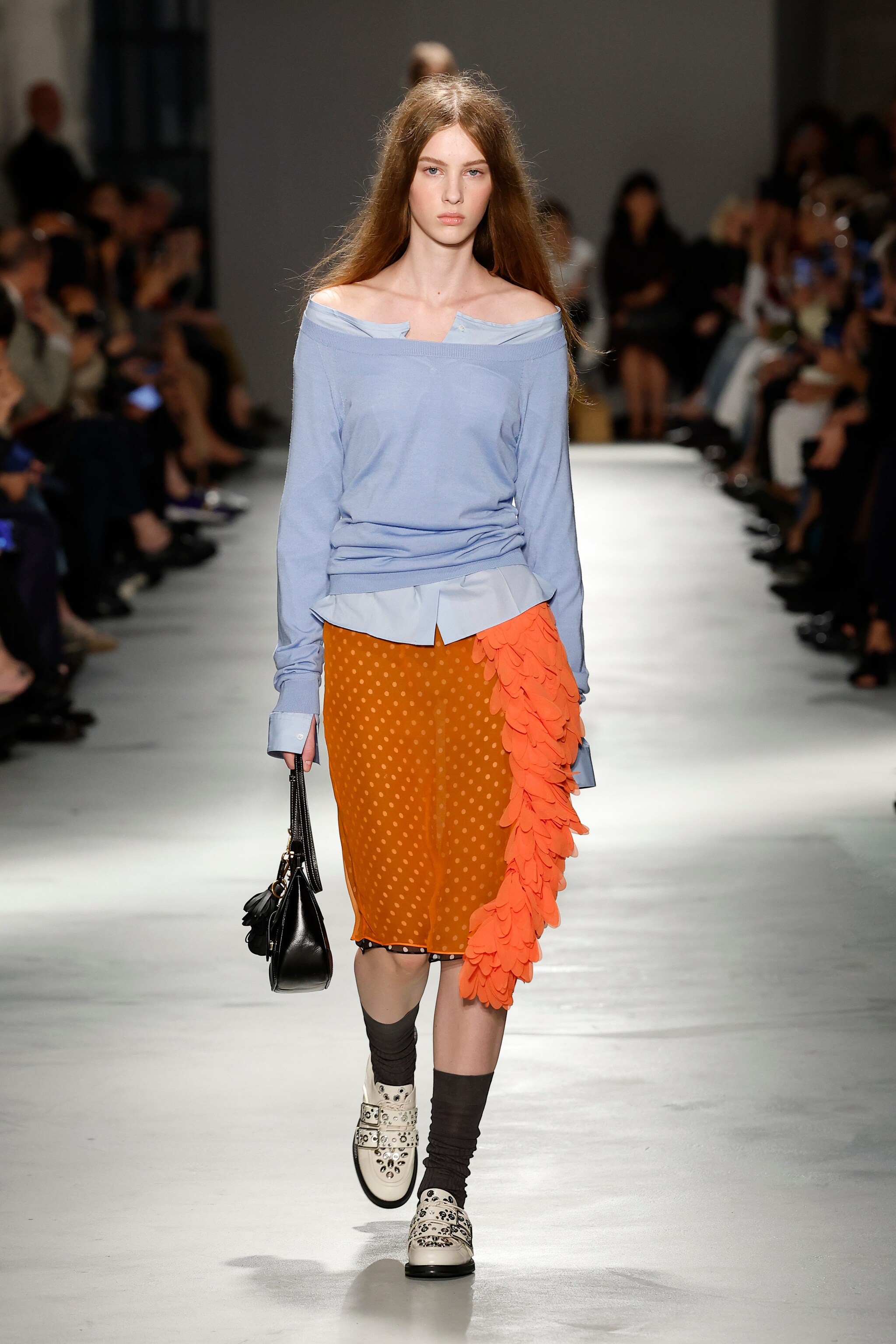 Giacche in pelle dalla silhouette eightees, abiti in lamè dorato, vestiti sottoveste indossati con maxi felpe e impalpabili modelli in seta trasparente sfilano alla Milano Fashion Week sulla passerella Primavera/Estate 2026 di N21