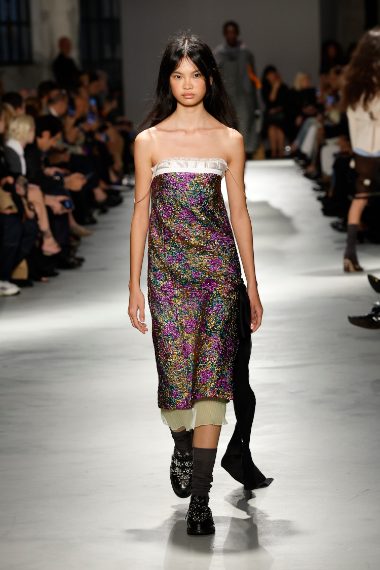 Giacche in pelle dalla silhouette eightees, abiti in lamè dorato, vestiti sottoveste indossati con maxi felpe e impalpabili modelli in seta trasparente sfilano alla Milano Fashion Week sulla passerella Primavera/Estate 2026 di N21
