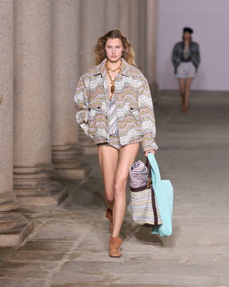 Bermuda, gonne e short costissimi accosstate a morbide giacche in cotone o a cardigan fantasia e ancora blazer gessati, baschi e maxi bag sfilano alla Milano Fashion Week sulla passerella Primavera/Estate 2026 di Missoni