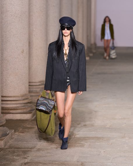 Bermuda, gonne e short costissimi accosstate a morbide giacche in cotone o a cardigan fantasia e ancora blazer gessati, baschi e maxi bag sfilano alla Milano Fashion Week sulla passerella Primavera/Estate 2026 di Missoni