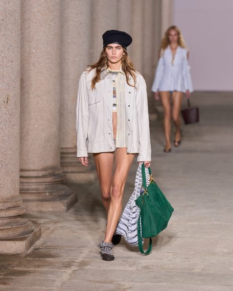Bermuda, gonne e short costissimi accosstate a morbide giacche in cotone o a cardigan fantasia e ancora blazer gessati, baschi e maxi bag sfilano alla Milano Fashion Week sulla passerella Primavera/Estate 2026 di Missoni
