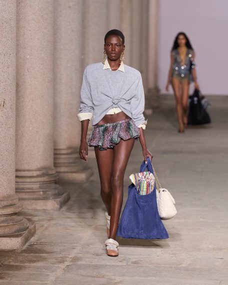 Bermuda, gonne e short costissimi accosstate a morbide giacche in cotone o a cardigan fantasia e ancora blazer gessati, baschi e maxi bag sfilano alla Milano Fashion Week sulla passerella Primavera/Estate 2026 di Missoni