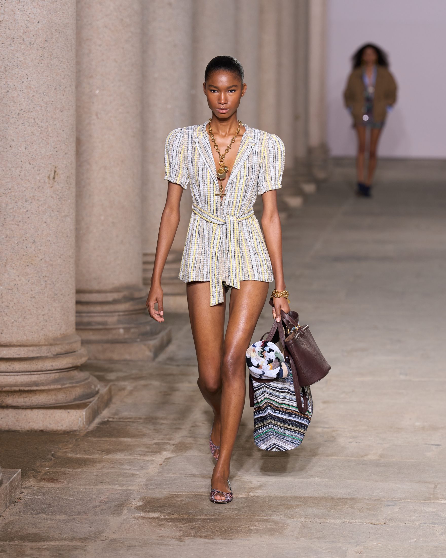 Bermuda, gonne e short costissimi accosstate a morbide giacche in cotone o a cardigan fantasia e ancora blazer gessati, baschi e maxi bag sfilano alla Milano Fashion Week sulla passerella Primavera/Estate 2026 di Missoni